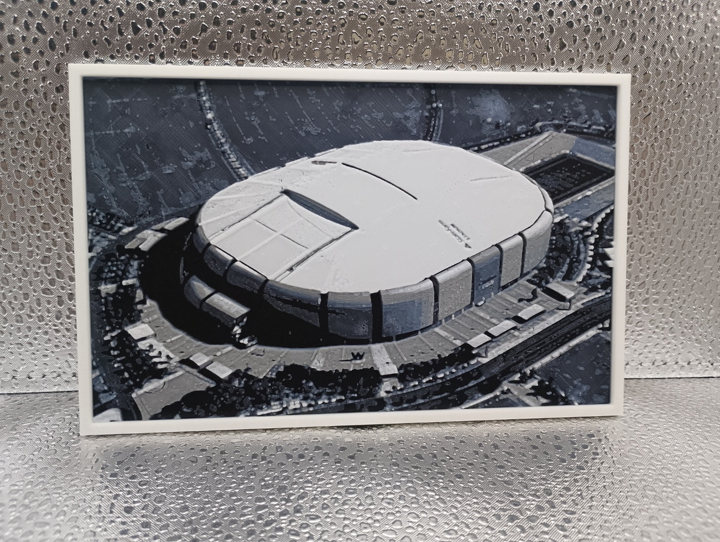 Printed in a monochrome palette against a solid dark background, the piece highlights the stadium’s geometry and architectural presence while maintaining the clean, modern aesthetic characteristic of your Hueforge collection. The integrated white frame provides a gallery-ready finish that is ideal for desks, offices, fan caves, or wall displays.