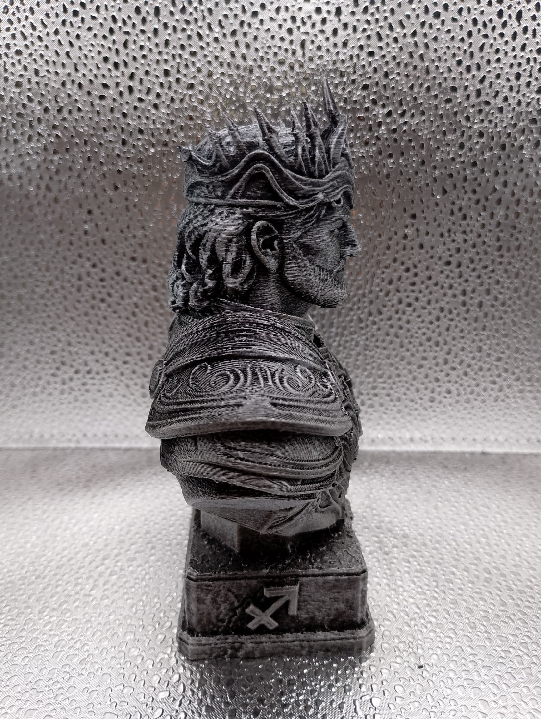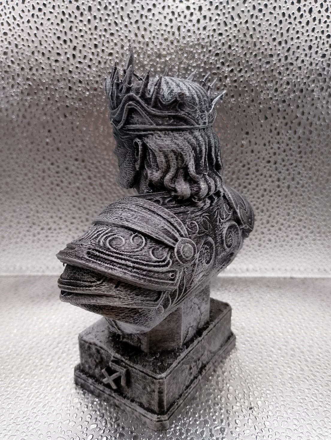 This Bust is 3D Printed using Black PLA Filament and Dry-brushed with Silver Gilding Wax to give it a Stone Statue effect.